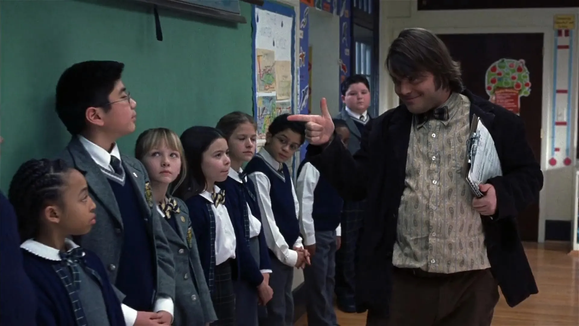 Cast: Jack Black as Dewey Finn, Joan Cusack as Rosalie Mullins, Mike White as Ned Schneebly, Sarah Silverman as Patty Di Marco, Lee Wilkof as Mr. Green, Kate McGregor-Stewart as Mrs. Lemmons, Adam Pascal as Theo, Suzzanne Douglas as Tomika's Mother, Miranda Cosgrove as Summer Hathaway, Kevin Clark as Freddy Jones, Joey Gaydos Jr. as Zack Mooneyham, Robert Tsai as Lawrence, Aleisha Allen as Alicia, Brian Falduto as Billy, Caitlin Hale as Marta, Maryam Hassan as Tomika, Chris Stack as Doug, Jordan-Claire Green as Michelle, Rivkah Reyes as Katie, Lucas Babin as Spider, Veronica Afflerbach as Eleni, Angelo Massagli as Frankie, Cole Hawkins as Leonard, James Hosey as Marco, Z Infante as Gordon, Jaclyn Neidenthal as Emily, Eron Otcasek as Musician, Carlos Velazquez as Musician, Kimberly Grigsby as Mrs. Sheinkopf, Wally Dunn as Gym Teacher, Tim Hopper as Zack's Father, Michael Dominguez-Rudolph as Art Student, Crash Cortez as Max, Nicky Katt as Razor, John Highsmith as Tony, Heather Goldenhersh as Sheila, Timothy "Speed" Levitch as Waiter, Scott Graham as Punk Rock Guy, Sharon Washington as Alicia's Mother, Kim Brockington as Leonard's Mother, Marty Murphy as Concerned Father, Kathleen McNenny as Freddy's Mother, Joanna Adler as Summer's Mother, Robert Lin as Lawrence's Father, Barry Shurchin as Cop, MacIntyre Dixon as Bus Driver, Amy Sedaris as Mrs. Haynish, Mary Fortune as Teacher's Assistant, Mandy Siegfried as Female Employee, Elle Key as Concert Goer, Carlos J. Da Silva as Security Guard, Ian O'Malley as Radio Exec, Chris Line as Radio DJ, Kyle Meaney as Toby, Frank Whaley as Battle of the Bands Director, Lauren Adler as Concert Goer, Kelly Anne Burns as Groupie, Leanne Cabrera as Concert Goer, Catherine A. Callahan as Concert Goer, Lucas Papaelias as Neil, Cedric Cannon as Leonard's Dad, Mike Clemente as Crazed Fan, Anivile Daniel as Concert Goer, Jane DeNoble as Billy's Mom, Caileigh Scott as Concert Goer, Karen Nazarov as Groupie, Riley G. Matthews Jr. as Blood Brothers MC Biker, Jada Montemarano as Student, Mateo Moreno as Concert Goer, Lian Moy as Student, Ryan O'Connor as No Vaccancy's Biggest Fan, Scott Ross as Concert Goer, Johnny Sullivan as Guy in Crowd Who Catches Dewey, Jamie Vergan as Concert Goer, Joe Wachowski as Concert Goer